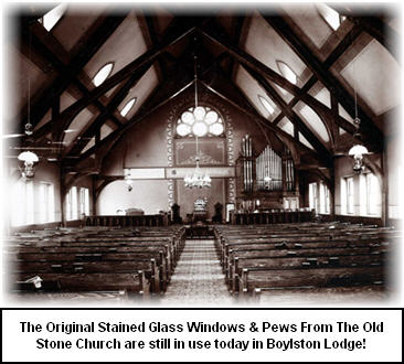 If you look at the picture to the left it shows the original interior of the Stone Church you will see the marked resemblance to the Boylston Lodge today.